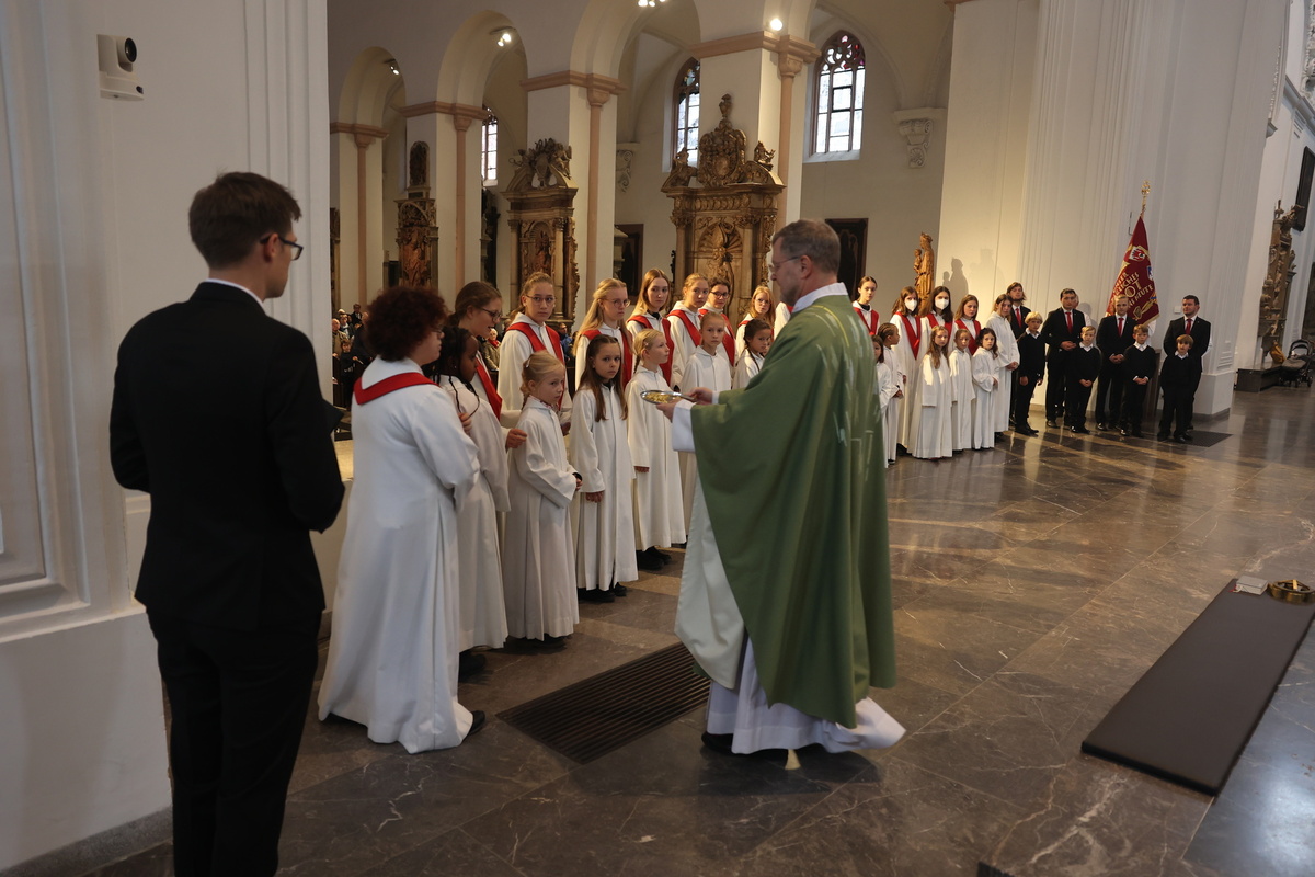Beim Erntedankgottesdienst segnete er die Chorabzeichen, die den Neuen von ihren Chorpatinnen und -paten ans Revers geheftet wurden. Unter der Leitung von Domkapellmeister Alexander Rüth gestalteten mehr als 100 Sängerinnen und Sänger der Jugendchöre der Dommusik die Messe. Die Feier, an der auch eine Fahnenabordnung der Bäckerinnung teilnahm, wurde von den Fernsehsendern Bibel TV und TV Mainfranken live ausgestrahlt und außerdem im Internet übertragen. In seiner Predigt hob der Generalvikar hervor, dass wichtige Dinge im Leben wie Geborgenheit, Segen und Liebe sich nicht kaufen ließen. Im Glauben gebe der Mensch eine unverzweckte Antwort auf Gottes Liebe. „Erntedank lenkt den Blick auf die Welt als Gottes gute Schöpfung – und wir Menschen sind ein Teil davon“, sagte der Generalvikar.