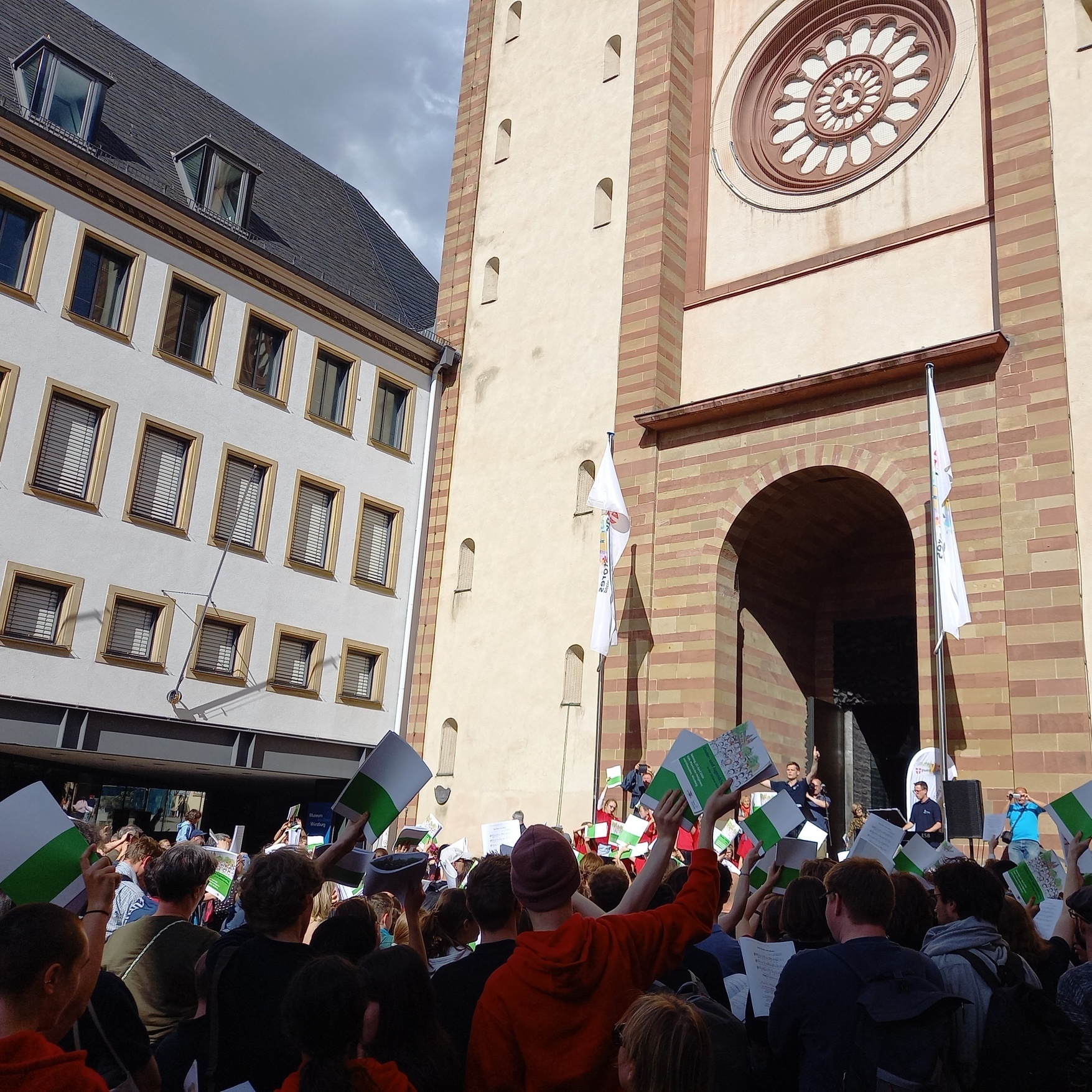 „Ihr habt heute in der Stadt eine Tonspur auf Eurem Weg hierher hinterlassen, die deutlich macht: Musik baut eine Brücke. Sie kann uns helfen, Gottes Nähe im Herzen zu spüren“, sagte der Generalvikar in seiner Predigt. Knapp 500 Kinder und Jugendliche aus über 20 Chören nahmen an der Veranstaltung teil. Singend zogen die Teilnehmerinnen und Teilnehmer vom Stadtteil Zellerau aus zuvor über die Alte Mainbrücke und begeisterten auf dem Domvorplatz Passanten mit einem spontanen Konzert. In der Pfarrkirche Heiligkreuz feierten die Mädchen und Jungen am Morgen mit Bischof em. Dr Friedhelm Hofmann eine Messe. Die jungen Sängerinnen und Sänger hatten ein umfangreiches musikalisches Programm für die Gestaltung der Gottesdienste vorbereitet. Zudem begegneten die Chorkinder und ‑jugendlichen einander beim gemeinsamen Mittagessen und den Freizeitangeboten wie Bouldern, Fußballspielen oder bei einer Führung durch die Feuerwehrschule Würzburg. Organisiert wurde der Tag vom Würzburger Diözesanverband der Pueri Cantores und den Würzburger Chören vor Ort: der Würzburger Kantorei aus dem Stadtteil Zellerau, den Domsingknaben und der Mädchenkantorei am Kiliansdom Würzburg. Bereits am Vorabend trafen sich die Jugendlichen der Chöre zu einer Lichtfeier mit Dekan Simon Mayer (Karlstadt) in der Pfarrkirche Sankt Burkard sowie zu einer Chorparty im Kilianeum-Haus der Jugend. (Markus Hauck)