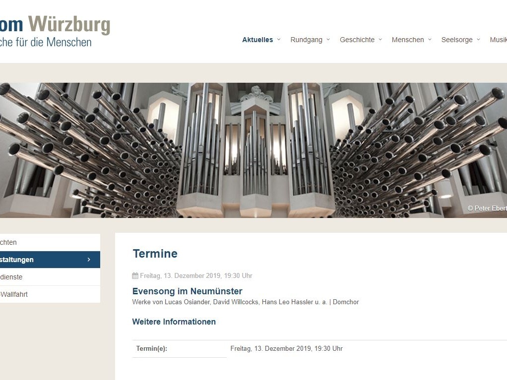 Bei der abendlichen Andachtsform, einer Mischung aus Komplet udn Vesper steht die chorale Musik im Focus. der Domchor singt Werke von Lucas Osiander, David Willcocks, Hans Leo Hassler u. a.