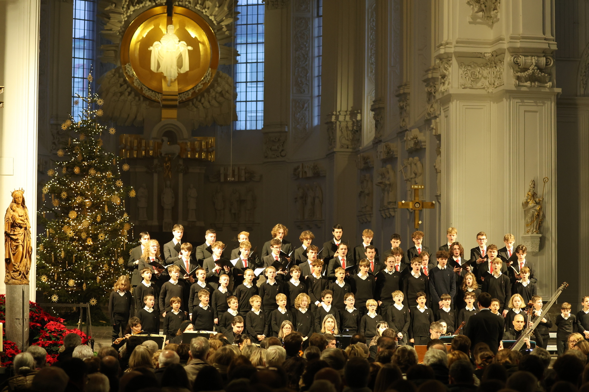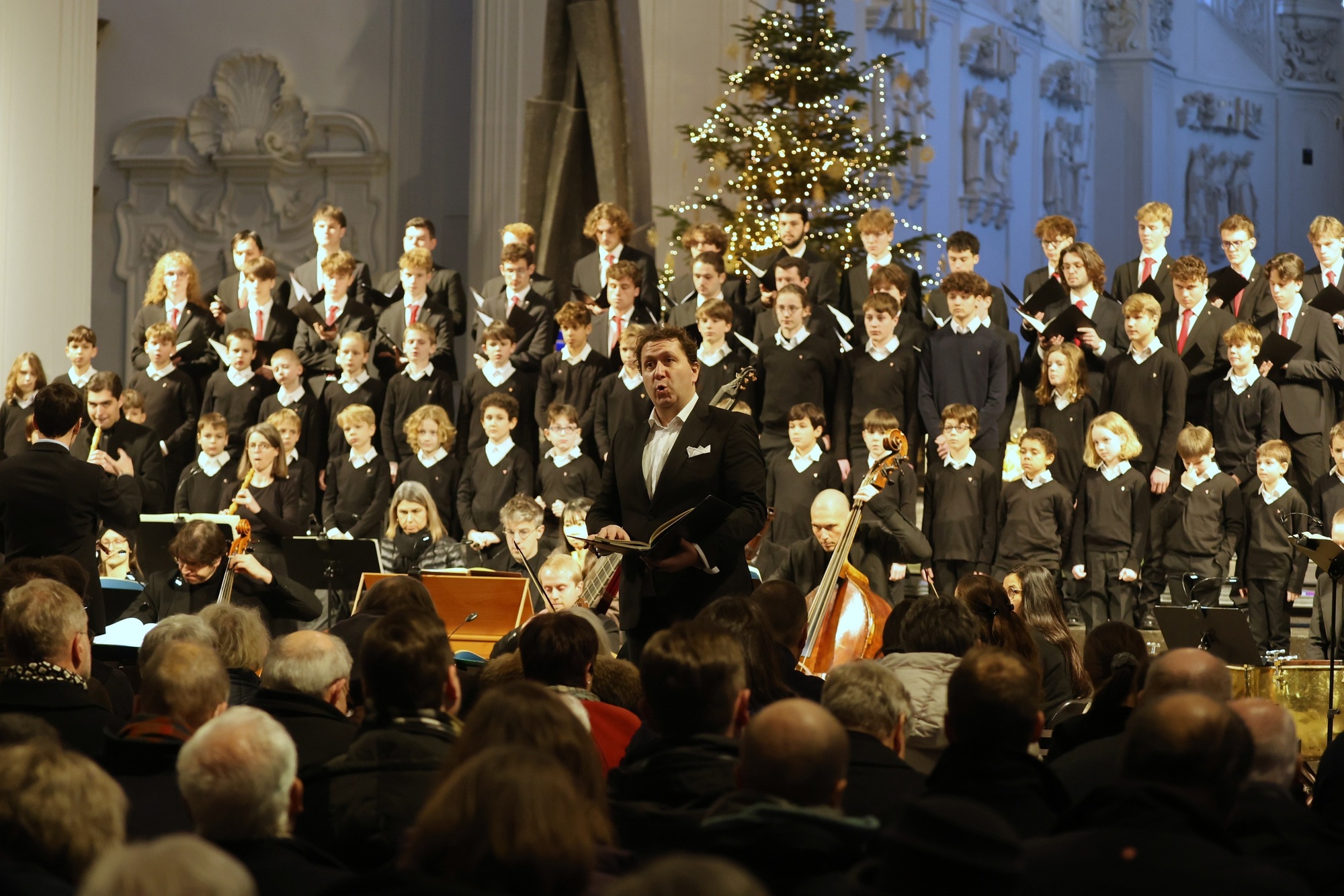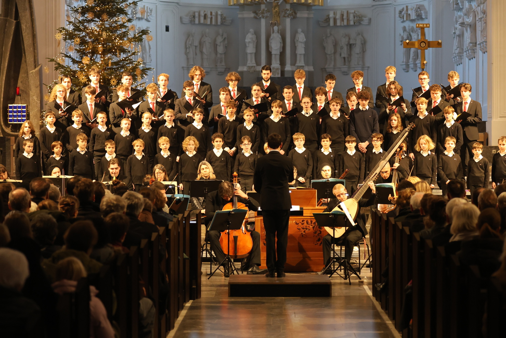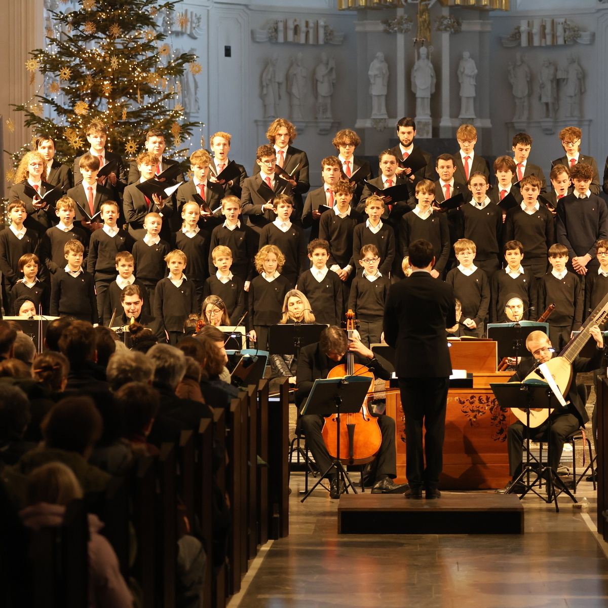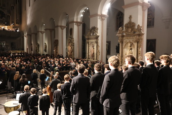 Voller Kraft und Freude, mit fröhlichem Akzent und begleitet von rauschenden Streichern setzen die Knaben ein. Sopran und Alt sangen auswendig, mit Konzentration, geschulten Stimmen, die jungen Tenöre und Bässe mit ihren roten Krawatten schauten zeitweise in ihre Noten. Gelassen, aber spürbar emphatisch führte Domkantor Julian Beutmiller durch fromme Choräle und pastorale Sequenzen. Dabei ließ er den Knaben und jungen Herren Zeit, entlockte ihnen so große Strahlkraft, Innigkeit und freudig-dankbare Vibes.