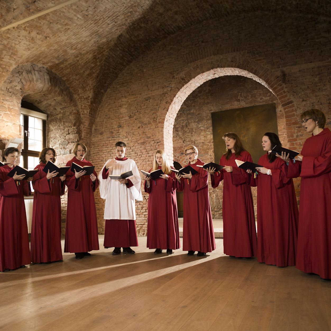 In der Krypta des Würzburger Doms, die zu den ältesten und atmosphärischsten Räumen der gesamten Bischofskirche gehört, kann sich der mystische Stil der mittelalterlichen Gesänge und der Klang der Frauenschola aufs beste entfalten. Tief unter dem mächtigen Dom eröffnet sich ein stiller, fast zeitloser Ort, geprägt von romanischen Gewölben, schlichten Steinstrukturen und einer spirituellen Ruhe.