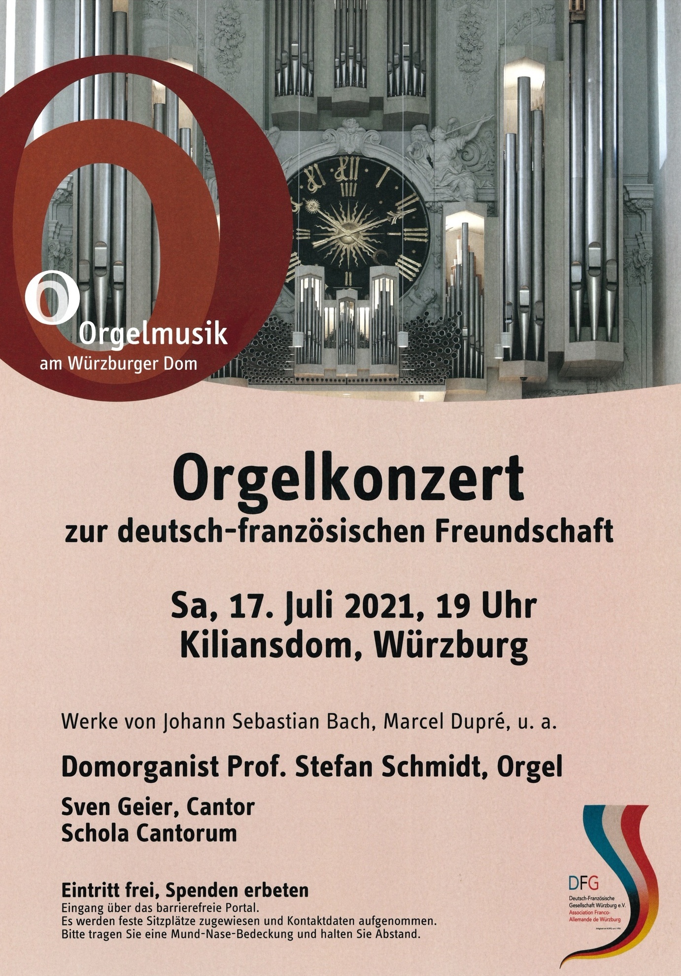 „Vive l'amitié franco-allemande“ unter diesem Motto veranstaltet die Dommusik am 17. Juli 2021 zum französischen Nationalfeiertag um 19.00 Uhr in Zusammenarbeit mit der deutsch-französischen Gesellschaft Würzburg e.V. ein Orgelkonzert im Kiliansdom. Domorganist Prof. Stefan Schmidt bringt Werke aus verschiedenen Epochen, die im Kontext der deutsch-französischen Beziehung stehen und jeweils auf ihre eigene Weise einen Bogen zur Gregorianik schlagen, zu Gehör.