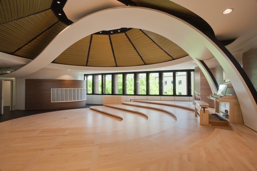 Wie ein Sog aus dem Flur entwickelt sich ein Flügel, der auf den großen Saal deutet und hinein begleitet. Seine Bewegung, die bei der Orgel endet, trägt die Geometrie einer Spirale, und gespannt wie die schützende Hand Gottes über den vielen Kindern, die hier singen, bleibt er unterhalb einer Kuppel aus 12 Trapezen aus Metallgewebe. Die Nachhallzeit beträgt 0,8-0,9 Sekunden.