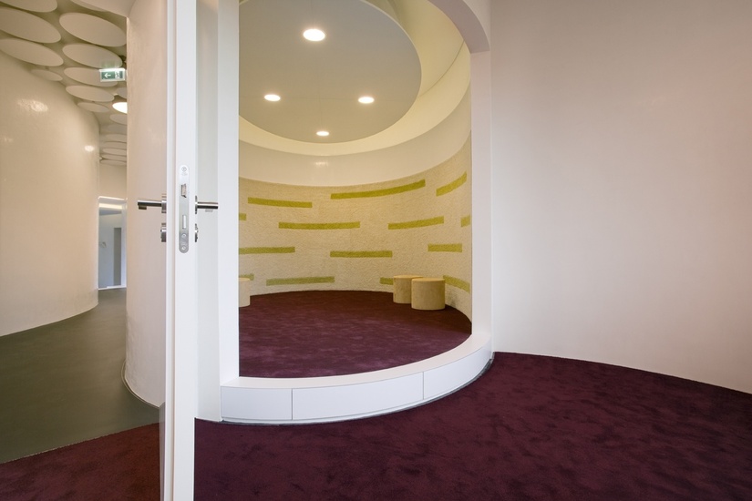 Der Flur in seiner bewegten Form suggeriert einen Blick wie ins Innere eines Musikinstrumentes, eine Art anatomische Betrachtung der Musik. Verdeutlicht wird dies mit dem Spiel Konkav-Konvex der Wände, die wie das Atmen der Sänger einmal komprimiert werden und dann die Luft entweichen lassen.